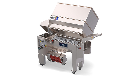 La structure du transporteur est à double canal pour faciliter le nettoyage entre la bande supérieure et la bande inférieure. En outre, le transporteur est doté d’un racleur avec un bassin de récupération. On peut l’équiper d’un variateur de vitesse.